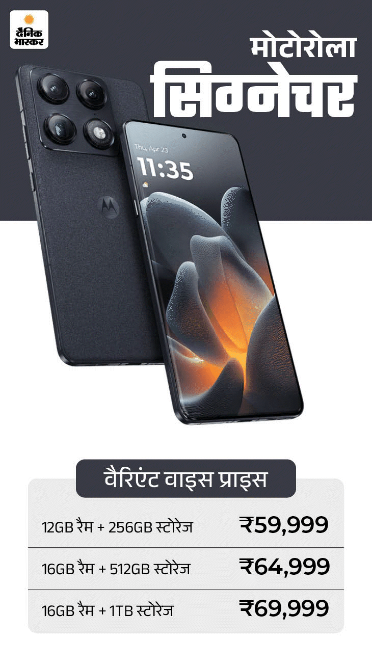 टेक कंपनी मोटोरोला ने आज (23 जनवरी) भारतीय बाजार में नया स्मार्टफोन मोटोरोला सिग्नेचर लॉन्च कर दिया है। स्मार्टफोन को स्नैपड्रैगन 8 जेन 5 ऑक्टा-कोर प्रोसेसर के साथ उतारा गया है। यह चिपसेट वाला ये भारत में दूसरा स्मार्टफोन है।