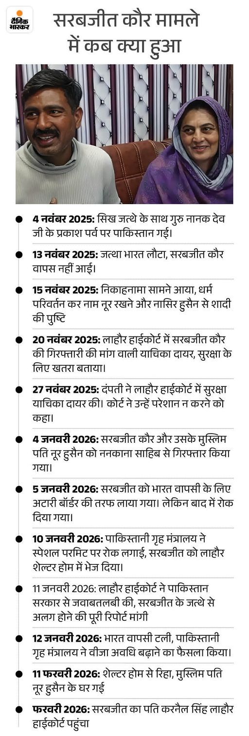 - सिख श्रद्धालुओं के साथ गई, वापस नहीं आई: सरबजीत कौर 4 नवंबर 2025 को श्री गुरु नानक देव जी के प्रकाश पर्व के अवसर पर 1932 श्रद्धालुओं के जत्थे के साथ अटारी बॉर्डर के जरिए पाकिस्तान गई थी। जत्था 10 दिनों तक विभिन्न गुरुधामों के दर्शन करने के बाद भारत लौट आया। लेकिन वापसी के समय 1922 श्रद्धालु ही लौटे। सरबजीत कौर जत्थे में शामिल नहीं मिलीं। मामले की गंभीरता को देखते हुए संबंधित भारतीय एजेंसियों ने सरबजीत कौर की तलाश शुरू की।