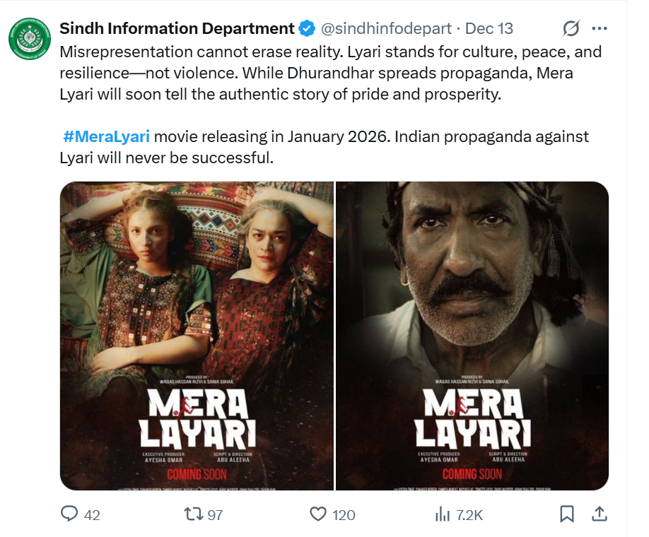 जहां धुरंधर दुष्प्रचार फैला रहा है, वहीं मेरा ल्यारी जल्द ही गौरव और समृद्धि की सच्ची कहानी बयां करेगा। फिल्म जनवरी 2026 में रिलीज होगी। ल्यारी के खिलाफ भारत का दुष्प्रचार कभी सफल नहीं होगा।’