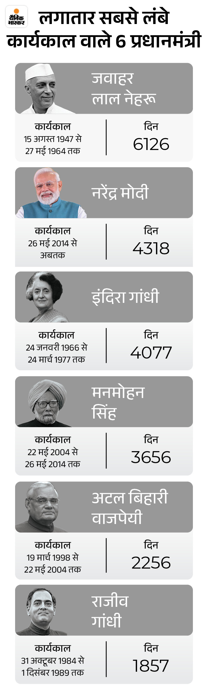हालांकि सबसे लंबे समय तक लगातार प्रधानमंत्री रहने का रिकॉर्ड जवाहरलाल नेहरू के नाम है। वे 15 अगस्त 1947 से 27 मई 1964 तक यानी लगातार कुल 6126 दिन तक इस पद पर रहे। PM मोदी नेहरू के रिकॉर्ड से 1812 दिन पीछे हैं। रिकॉर्ड तोड़ने के लिए 2029 के बाद भी PM रहना पड़ेगा।