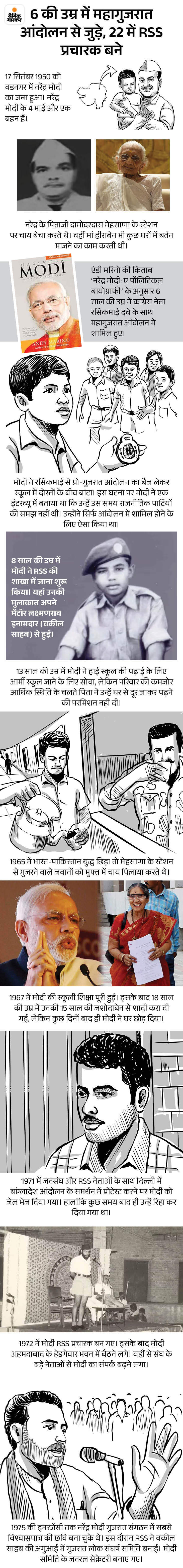 17 सितंबर को जन्मे नरेंद्र मोदी 6 साल की उम्र में ही कांग्रेस की ओर से महागुजरात आंदोलन का हिस्सा बने। फिर 8 साल की उम्र में RSS से जुड़ गए थे। 7 अक्टूबर 2001 को 51 साल की उम्र में बिना विधायक बने ही मोदी गुजरात के 14वें मुख्यमंत्री बने। 24 सालों में 14 साल गुजरात के मुख्यमंत्री रहे और अब तीसरी बार देश के प्रधानमंत्री हैं।