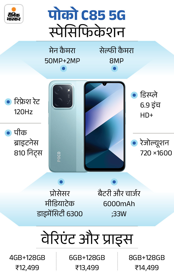 Poco C85 5G Launched in India: 6000mAh Battery, 6.9-inch Display Starting at ₹12,499 | पोको C85 5G स्मार्टफोन भारत में लॉन्च: 6.9-इंच 120Hz डिस्प्ले और 6,000mAh बैटरी; कीमत ₹12,499 से शुरू