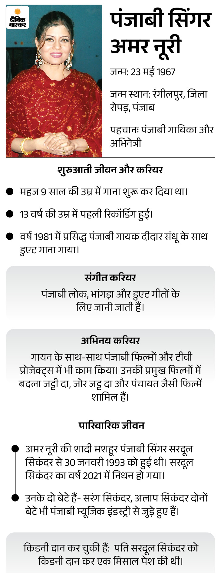 सिंगर अमर नूरी स्वर्गीय गायक सरदूल सिकंदर की पत्नी हैं, उनके 2 बेटे हैं।