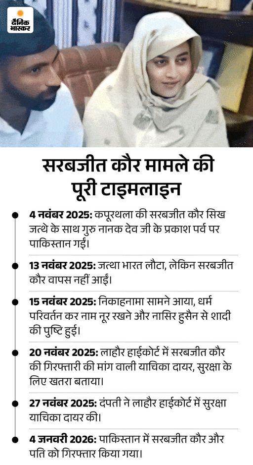 चार जनवरी को ही हुई गिरफ्तारी, लाहौर हाईकोर्ट पहुंचा मामला पाकिस्तान पुलिस ने चार जनवरी को सरबजीत और उसके पति नासिर हुसैन को गिरफ्तार किया था। उसकी पुलिस कस्टडी के दौरान की फोटो भी सामने आई थी। इसी बीच पता चला था कि सरबजीत और नासिर हुसैन ने कोर्ट में याचिका दायर की थी। इसमें उन्होंने आरोप लगाया था कि पाकिस्तान की पुलिस और अधिकारी उन्हें लगातार परेशान कर रहे हैं। इस मामले में नवंबर में ही लाहौर हाईकोर्ट के जज फारुख हैदर ने फैसला दिया था कि अगर शादी और धर्म परिवर्तन सरबजीत की मर्जी से हुआ तो अधिकारी उन्हें परेशान न करें।