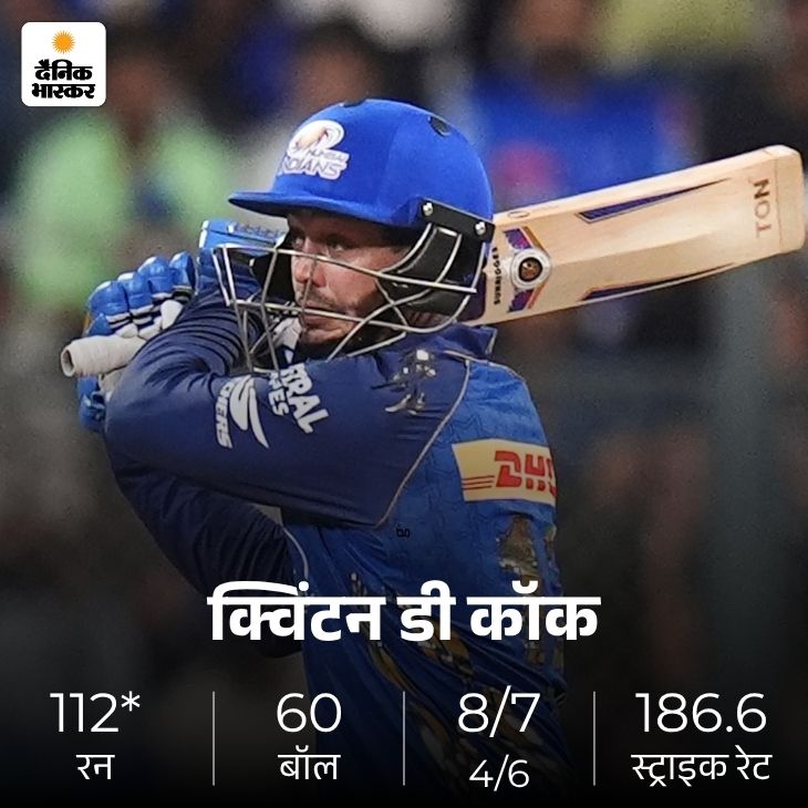 डी कॉक का शतक मुंबई के काम न आया मुंबई से इस सीजन का पहला मैच खेल रहे ओपनर क्विंटन डी कॉक ने 112 रन की शतकीय पारी खेली। 60 बॉल की पारी में उन्होंने 8 चौके और 7 छक्के लगाए। उनके अलावा, नमन धीर ने 50 रन बनाए। लेकिन, ये दोनों अपनी टीम को जीत नहीं दिला सके।