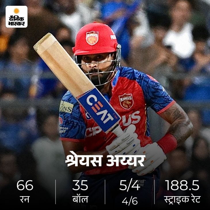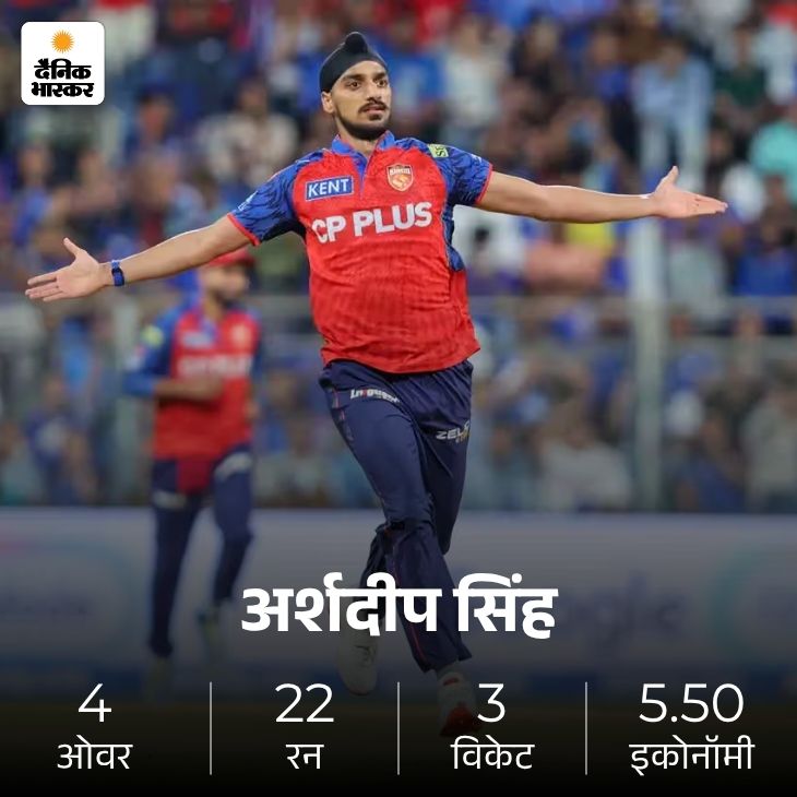 अर्शदीप सिंह हैट्रिक चूके, पर 3 विकेट झटके पंजाब की ओर से अर्शदीप सिंह ने 3 विकेट झटके। उन्होंने मुंबई की पारी के 18वें ओवर में शेरफन रदरफोर्ड (एक रन) को बोल्ड कर दिया। अर्श ने रायन रिकेल्टन और सूर्यकुमार यादव को लगातार दो बॉल पर आउट किया, लेकिन हैट्रिक पूरी नहीं कर सके। वे प्लेयर ऑफ द मैच चुने गए।
