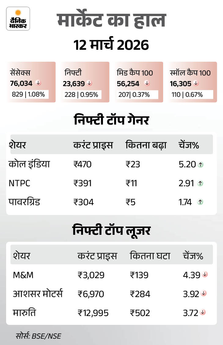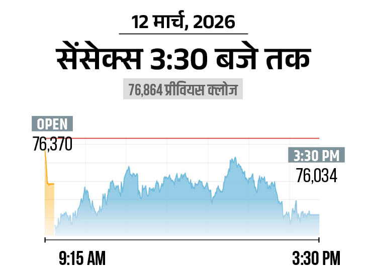 अमेरिका-इजराइल और ईरान के कारण शेयर बाजार में आज यानी 12 मार्च को लगातार दूसरे गिरावट रही। सेंसेक्स 829 अंक (1.08%) की गिरावट के साथ 76,034 पर बंद हुआ।