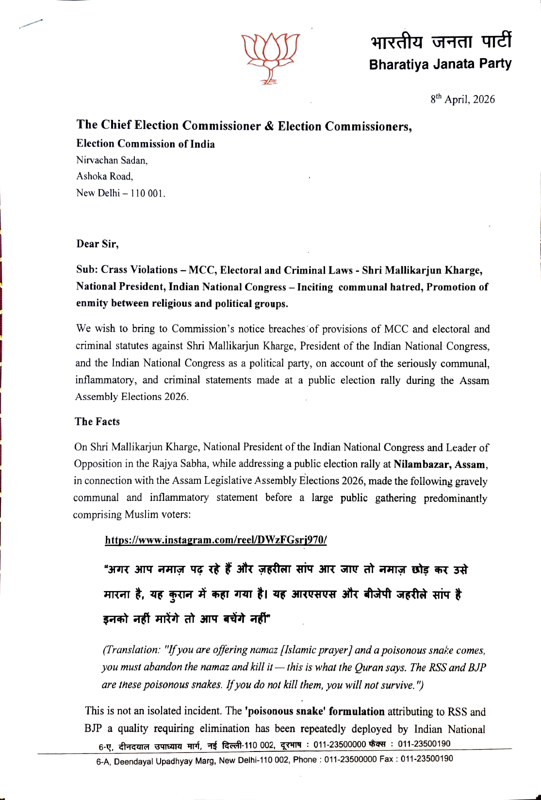 दरअसल 7 अप्रैल को असम में एक रैली को संबोधित करते हुए खड़गे ने कहा था कि अगर आप नमाज पढ़ रहे हैं और जहरीला सांप आ जाए तो नमाज छोड़कर उसे मारना है, यह कुरान में कहा गया है। यह आरएसएस और बीजेपी जहरीले सांप हैं इनको नहीं मारेंगे तो आप बचेंगे नहीं।