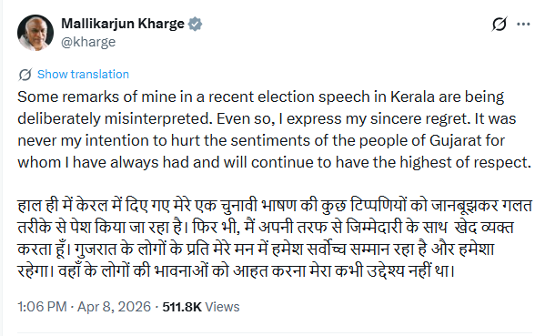 खड़गे ने 5 अप्रैल को केरल के इडुक्की में कहा था कि राज्य के लोग ‘पढ़े-लिखे और समझदार’ हैं और उन्हें गुमराह नहीं किया जा सकता, जबकि गुजरात और कुछ अन्य जगहों के लोग ‘अनपढ़’ हैं।