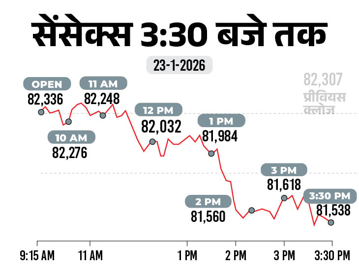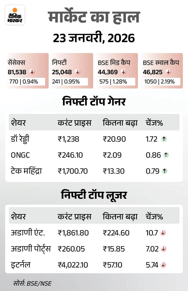 शेयर मार्केट में आज यानी 23 जनवरी को गिरावट रही। सेंसेक्स 770 अंक की गिरावट के साथ 81,538 पर बंद हुआ है। यह इस हफ्ते की चौथी बड़ी बिकवाली रही। वहीं निफ्टी में भी करीब 241अंक की गिरावट रही, ये 25,048 पर बंद हुआ।