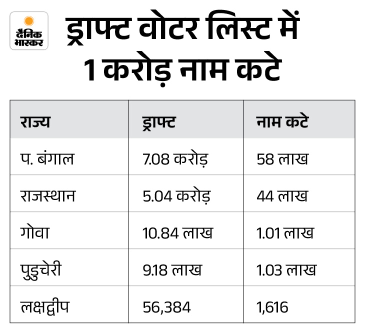 SIR Draft Voter List 2025 Update; West Bengal Rajasthan | Goa Lakshadweep | 5 राज्यों-UT में SIR की ड्राफ्ट वोटर लिस्ट जारी: 1 करोड़ से ज्यादा नाम कटे, ये कुल मतदाताओं का 7.6%; सबसे ज्यादा 58 लाख बंगाल में