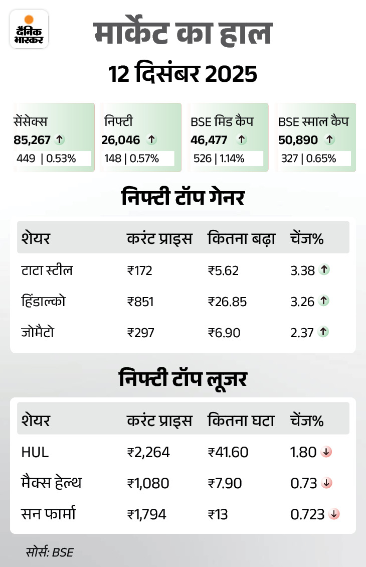 हफ्ते के आखिरी कारोबारी दिन आज यानी शुक्रवार, 12 दिसंबर को सेंसेक्स 449 अंक चढ़कर 85,267 के स्तर पर बंद हुआ। निफ्टी भी 148 अंक चढ़ा, ये 26,046 के स्तर पर बंद हुआ।