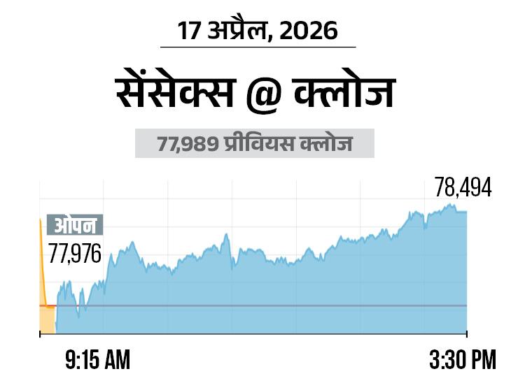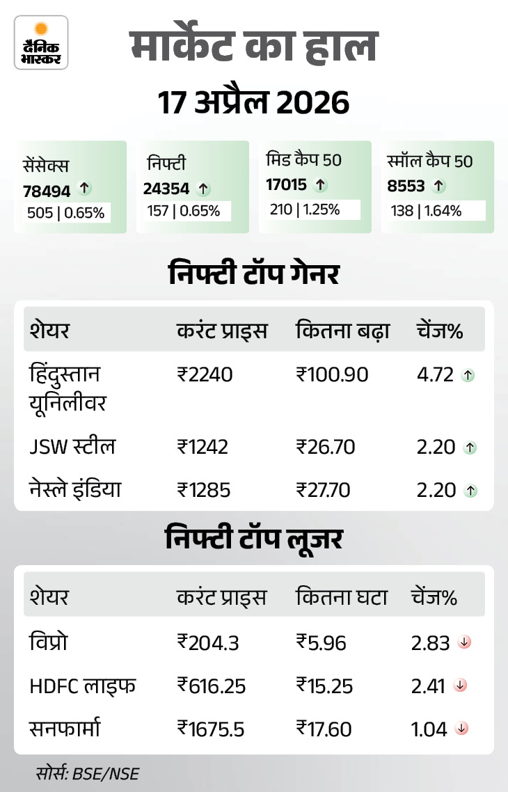 हफ्ते के आखिरी कारोबारी दिन आज यानी शुक्रवार 17 अप्रैल को सेंसेक्स 505 अंक (0.65%) की तेजी के साथ 78,494 पर बंद हुआ। निफ्टी में भी 157 अंकों (0.65%) की तेजी रही, ये 24,354 पर पहुंच गया। आज के कारोबार में FMCG,मीडिया और मेटल शेयरों में खरीदारी रही, जबकि आईटी शेयरों में बिकवाली रही।