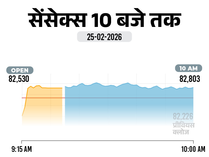 सेंसेक्स में आज यानी बुधवार 25 फरवरी को तेजी है। ये 600 अंक (0.70%) चढ़कर 82,850 पर कारोबार कर रहा है। निफ्टी में भी करीब 200 अंक (0.80%) की तेजी है। ये 25,600 के स्तर पर आ गया है। आज के कारोबार में मेटल-आईटी शेयरों में खरीदारी है।