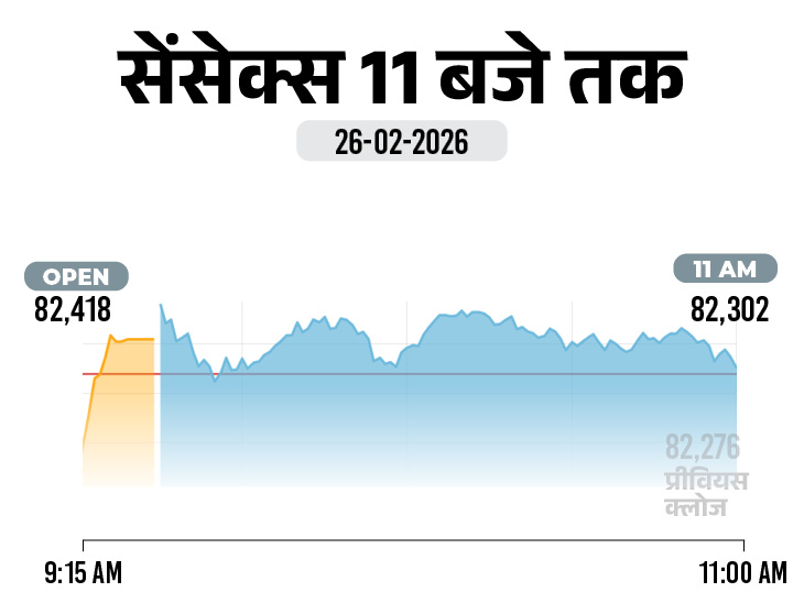 सेंसेक्स में आज यानी, 26 फरवरी को मामूली तेजी है। ये करीब 250 अंक चढ़कर 82,500 के पार कारोबार कर रहा है। वहीं निफ्टी में 80 अंक की तेजी है। ये 25,550 के स्तर पर है। आज के कारोबार में सरकारी बैंकों के शेयरों में खरीदारी है। रियल्टी शेयरों में गिरावट है।