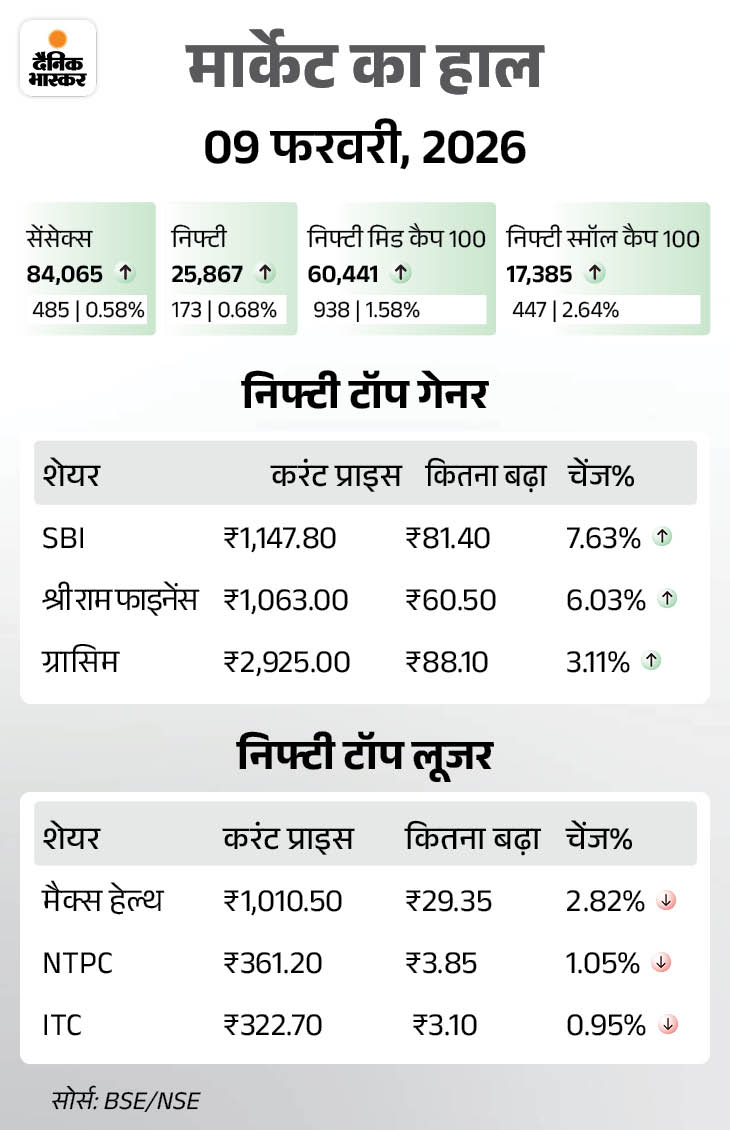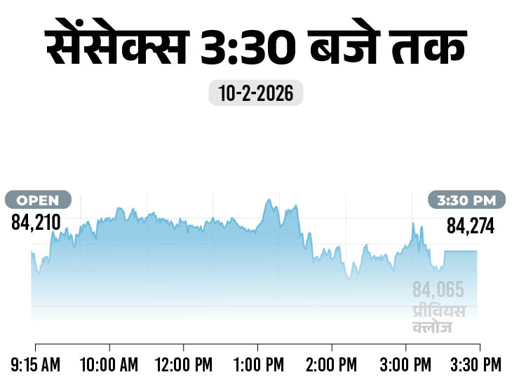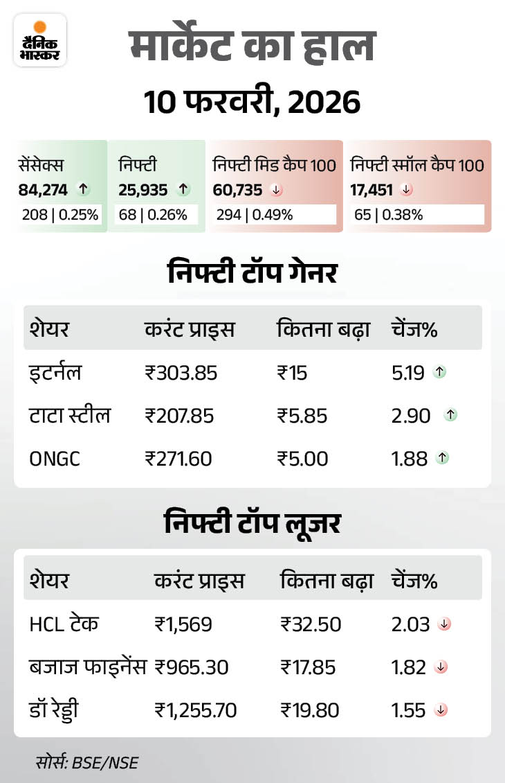 शेयर बाजार में आज यानी 10 फरवरी को बढ़त रही। सेंसेक्स करीब 208 अंक की तेजी के साथ 84,274 पर बंद हुआ है। वहीं निफ्टी में 68 की अंक बढ़त रही, ये 25,935 पर कारोबार कर रहा है। वहीं आज ऑटो, आईटी और मीडिया शेयर्स में बढ़त रही है। ऑटो सेक्टर सबसे ज्यादा 1.37% चढ़ा है।