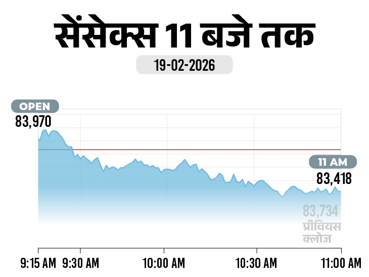 शेयर बाजार में आज यानी 19 फरवरी को गिरावट है। सेंसेक्स करीब 500 अंक की गिरावट के साथ 83,500 के स्तर पर कारोबार कर रहा है।