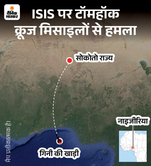 अमेरिकी रक्षा विभाग के एक अधिकारी के मुताबिक, ये हमले नौसेना के एक जहाज से दागी गई दर्जन से ज्यादा टॉमहॉक क्रूज मिसाइलों से किए गए। गिनी की खाड़ी से दागी गईं ये मिसाइलें नाइजीरिया के सोकोतो राज्य में ISIS के दो ठिकानों पर गिरीं। यह इलाका नाइजर सीमा के पास है, जहां ISIS-सहेल नाम का गुट सक्रिय है।