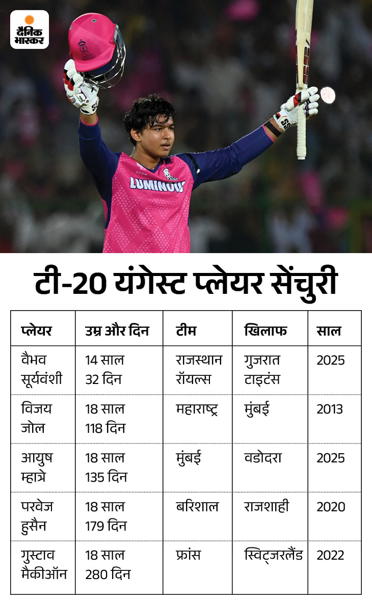 वैभव टी-20 में शतक लगाने वाले यंगेस्ट बैटर टी-20 क्रिकेट में अब तक के सबसे युवा शतक लगाने वाले खिलाड़ियों में वैभव सूर्यवंशी का नाम सबसे ऊपर आता है। उन्होंने 14 साल 32 दिन की उम्र में राजस्थान रॉयल्स के लिए गुजरात टाइटंस के खिलाफ 35 बॉल में शतक पूरा किया। इसके बाद, विजय जोल ने 18 साल 118 दिन में महाराष्ट्र के लिए मुंबई के खिलाफ 2013 में शतक लगाया था।
