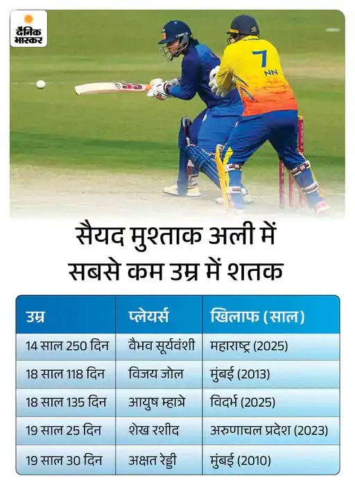 वैभव मुश्ताक अली में शतक लगाने वाले यंगेस्ट बैटर वैभव ने 10 दिन पहले सैयद मुश्ताक अली ट्रॉफी में भी शतक लगाया था। 14 साल के वैभव टूर्नामेंट में सबसे कम उम्र में शतक लगाने वाले बल्लेबाज बने थे। उन्होंने 2 दिसंबर को ईडन गार्डन्स में महाराष्ट्र के खिलाफ 61 गेंदों में नाबाद 108 रन बनाए, जिसमें 7 चौके और 7 छक्के शामिल थे। साथ ही वैभव 14 की उम्र में 3 टी-20 सेंचुरी लगाने वाले इकलौते प्लेयर हैं।