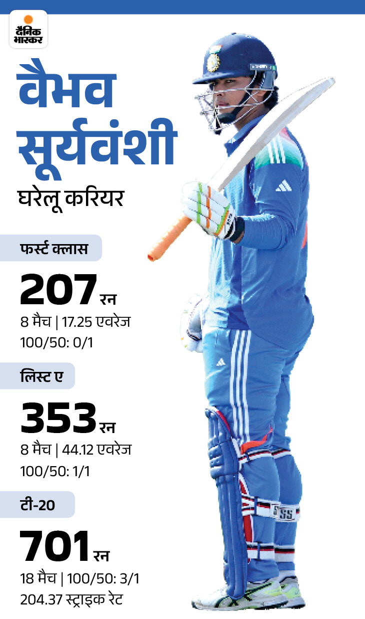 वैभव सूर्यवंशी ने बिहार के लिए अबतक 8 फर्स्ट क्लास और 8 ही लिस्ट-ए मुकाबले खेले हैं। वैभव ने फर्स्ट क्लास मैचों में जहां 207 रन बनाएं हैं, तो वहीं लिस्ट-ए में उनके नाम 353 रन दर्ज हैं। उनके नाम 18 टी-20 में 701 रन दर्ज हैं।