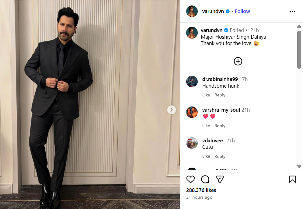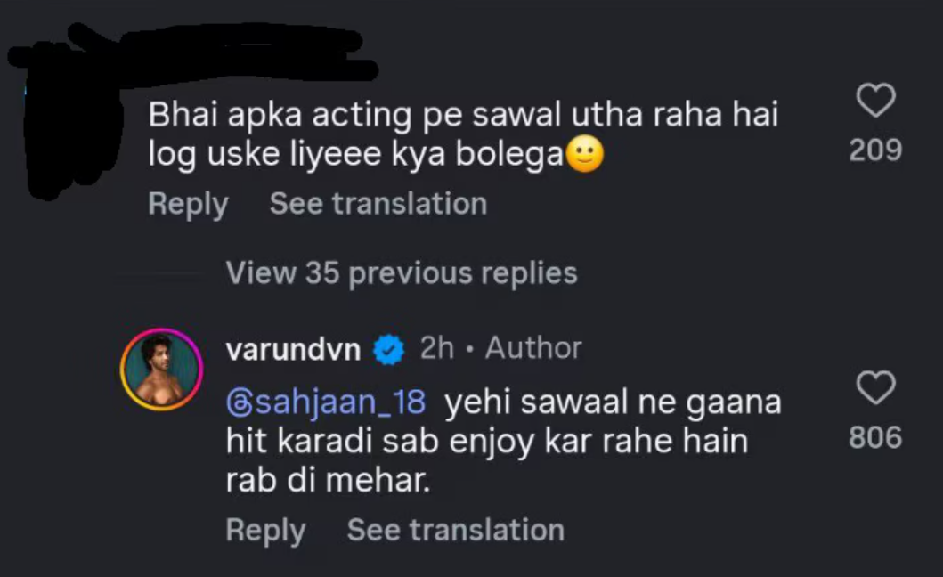 एक्टर के इस पोस्ट पर उनके फैंस और आलोचक दोनों ने कमेंट किए। एक यूजर ने वरुण से पूछा- ‘भाई लोग आपकी एक्टिंग पर सवाल उठा रहे हैं। उसके लिए क्या बोलेंगे?’ इसका जवाब देते हुए वरुण ने लिखा- ‘यही सवाल ने गाना हिट करा दी सब एन्जॉय कर रहे हैं… रब दी मेहर।’