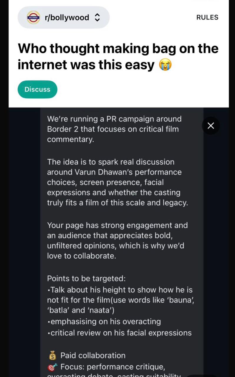 वायरल स्क्रीनशॉट में लिखा गया है- ‘हम बॉर्डर 2 को लेकर एक PR कैंपेन चला रहे हैं, जो फिल्म के निगेटिव कमेंट पर आधारित है। इस कैंपेन का मकसद वरुण धवन के परफॉर्मेंस च्वाइस,स्क्रीन प्रेजेंस, फेशियल एक्सप्रेशन और इस बात पर बहस शुरू करना है कि क्या उनकी कास्टिंग इतनी बड़ी फिल्म और उसकी लीगेसी पर फिट बैठती है।