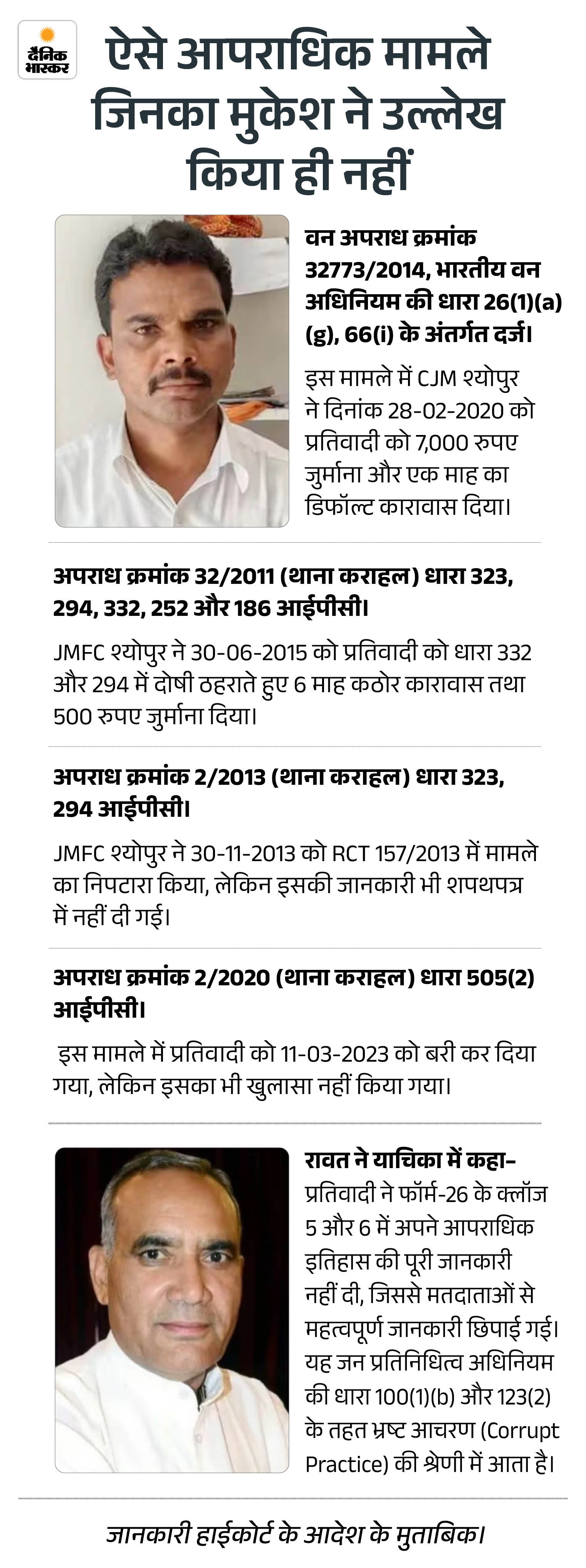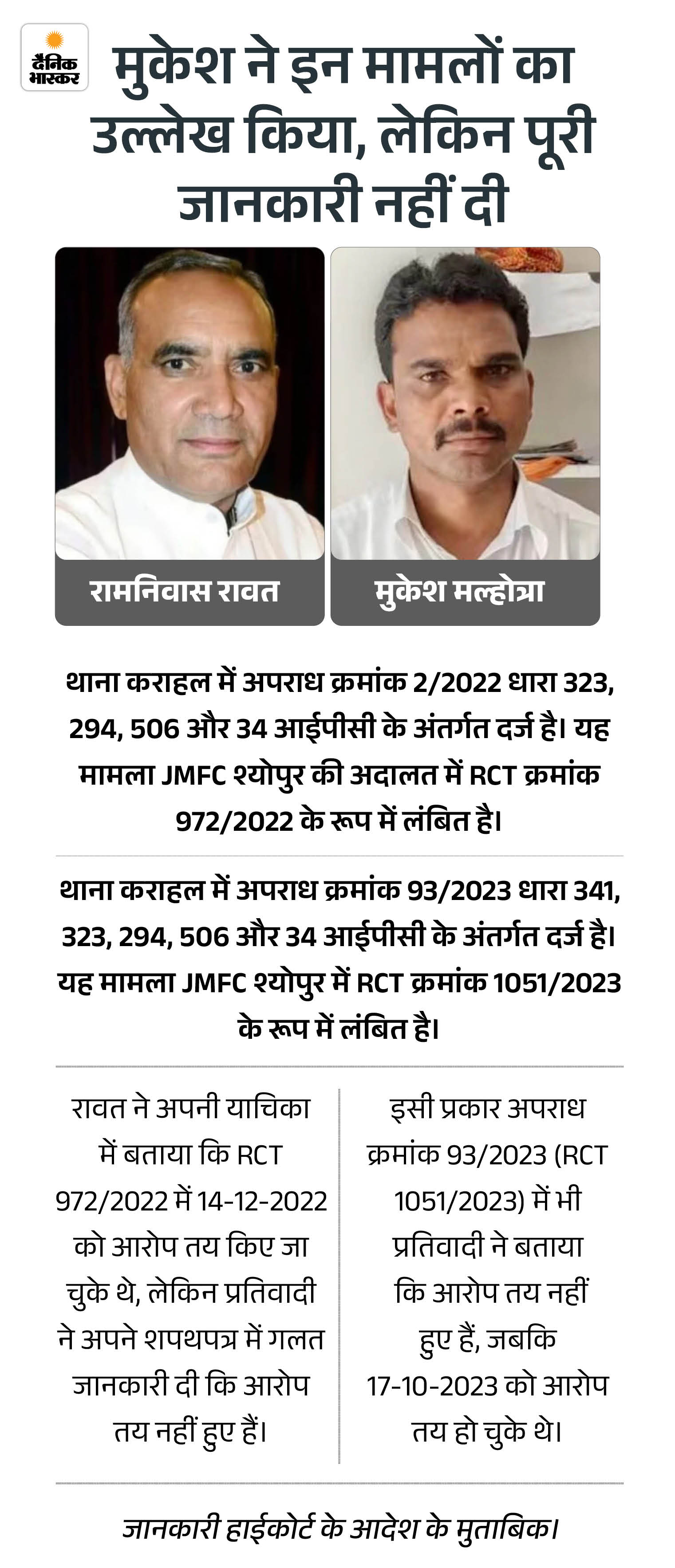 सुप्रीम कोर्ट से राहत मिलने के बाद विधायक मुकेश मल्होत्रा ने वीडियो जारी कर कहा- सुप्रीम कोर्ट ने जो सम्मानजनक फैसला दिया है, उससे मैं संतुष्ट हूं। ये विजयपुर की जनता के एक-एक मत की जीत है। पूर्व मंत्री रामनिवास रावत आरोप लगा रहे थे कि मैंने केस छिपाए हैं। मैंने कोई केस नहीं छिपाए।