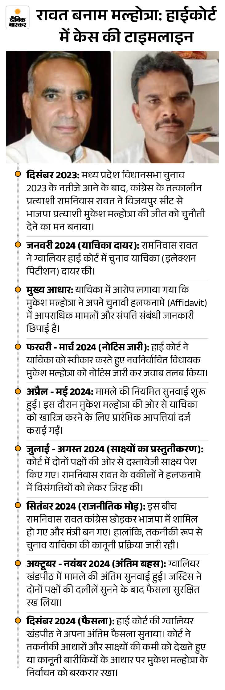 ग्वालियर हाईकोर्ट ने विजयपुर विधानसभा सीट से कांग्रेस विधायक मुकेश मल्होत्रा का चुनाव रद्द कर दिया है। ग्वालियर बेंच के जस्टिस जी.एस. अहलूवालिया ने यह फैसला BJP नेता और पूर्व मंत्री रामनिवास रावत की याचिका पर सुनाया। रावत अब विजयपुर विधानसभा सीट से नए MLA होंगे। पढ़ें पूरी खबर