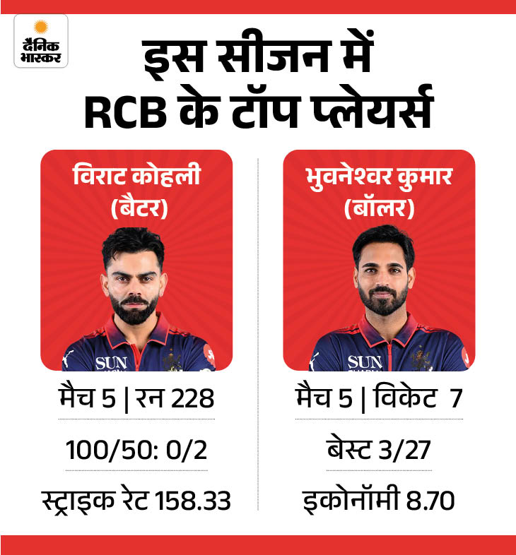कप्तान रजत पाटीदार, देवदत्त पडिक्कल, फिल सॉल्ट और टिम डेविड ने शानदार पारियां खेलकर टीम की जीत में अहम भूमिका निभाई है। कोहली अब ज्यादा खुलकर खेल पा रहे हैं क्योंकि उन्हें पता है कि मिडिल ऑर्डर में रन बनाने वाले खिलाड़ी मौजूद हैं।