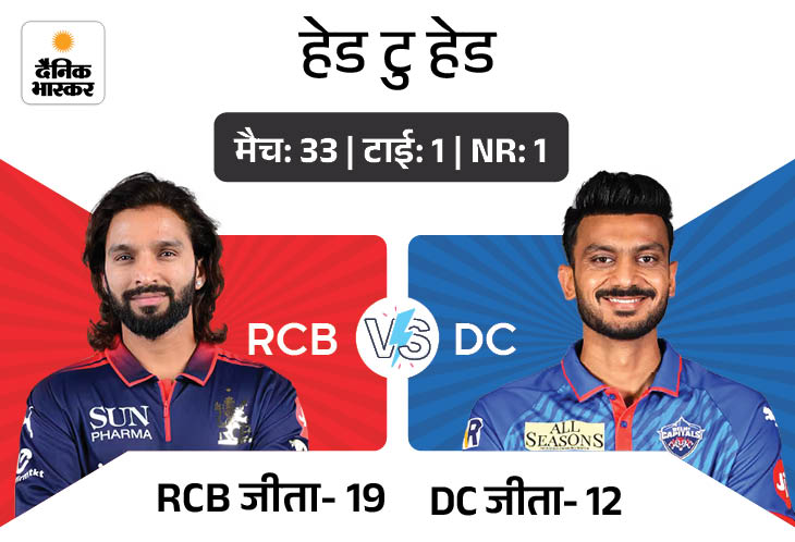 वहीं, दोनों टीमों के बीच अब तक 33 मैच खेले गए हैं, जिनमें रॉयल चैलेंजर्स बेंगलुरु (RCB) ने 19 मुकाबले जीते हैं। जबकि दिल्ली कैपिटल्स (DC) को 12 मैचों में जीत मिली है। इसके अलावा एक मैच टाई रहा है और एक मुकाबले का कोई परिणाम नहीं निकल सका।
