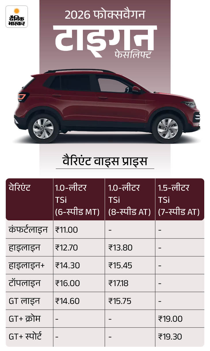 फॉक्सवैगन टाइगुन फेसलिफ्ट की शुरुआती एक्स-शोरूम कीमत ₹11 लाख तय की गई है, जो टॉप मॉडल के लिए ₹19.3 लाख तक जाती है।