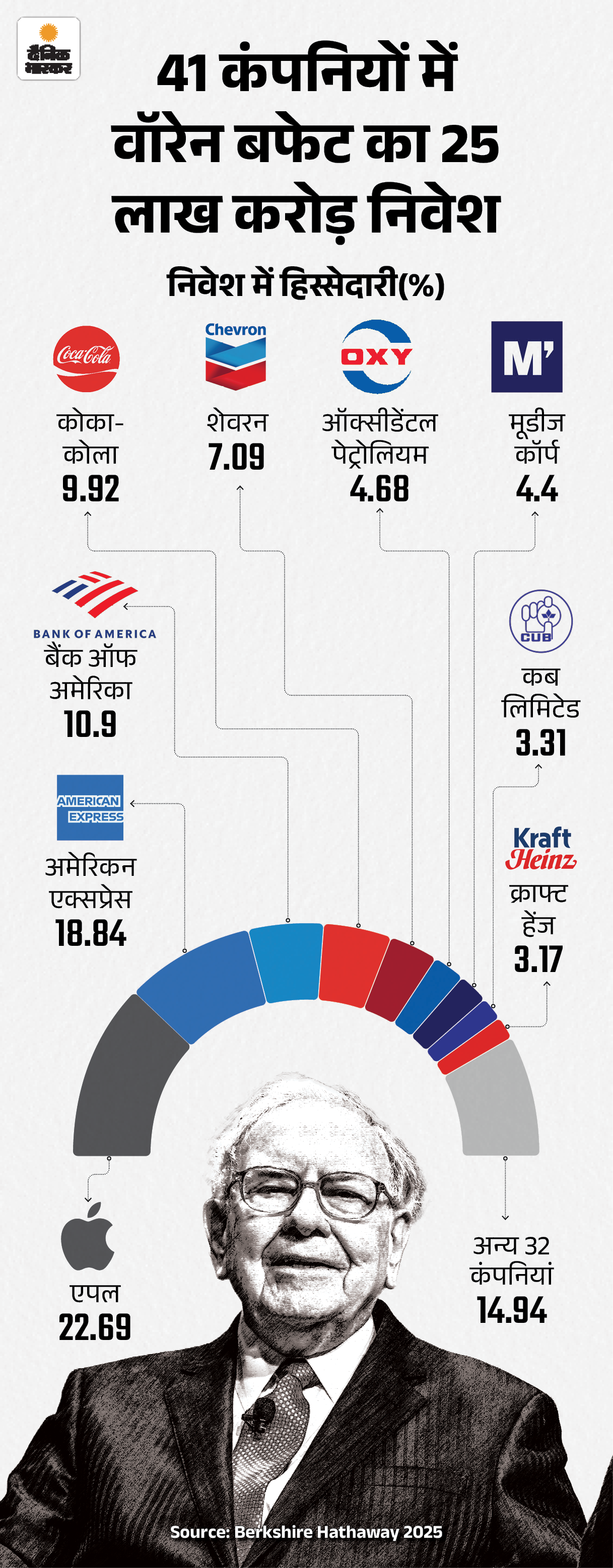 वॉरेन के सीईओ रहते बर्कशायर हैथवे ने एपल, कोका-कोला और बैंक ऑफ अमेरिका समेत 41 कंपनियों में 25 लाख करोड़ रुपए से ज्यादा निवेश किए। अगस्त 2024 में बर्कशायर हैथवे एक ट्रिलियन डॉलर यानी 90 लाख करोड़ रुपए की मार्केट कैप वाली अमेरिका की पहली नॉन-टेक कंपनी बनी। बर्कशायर हैथवे के पास करीब 34 लाख करोड़ रुपए नकद हैं, जो दुनिया में सबसे ज्यादा है।