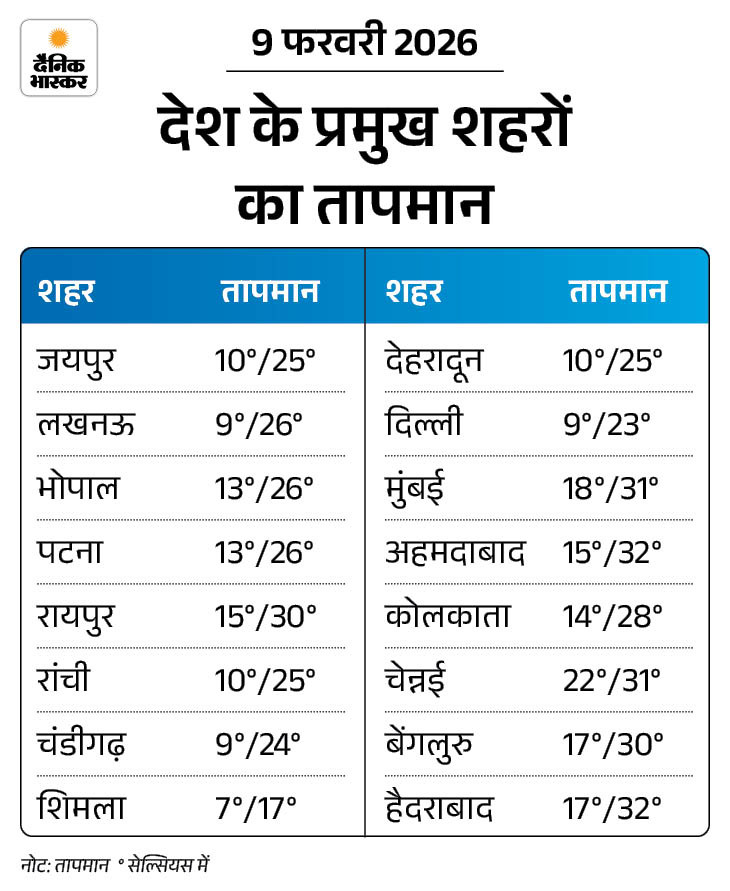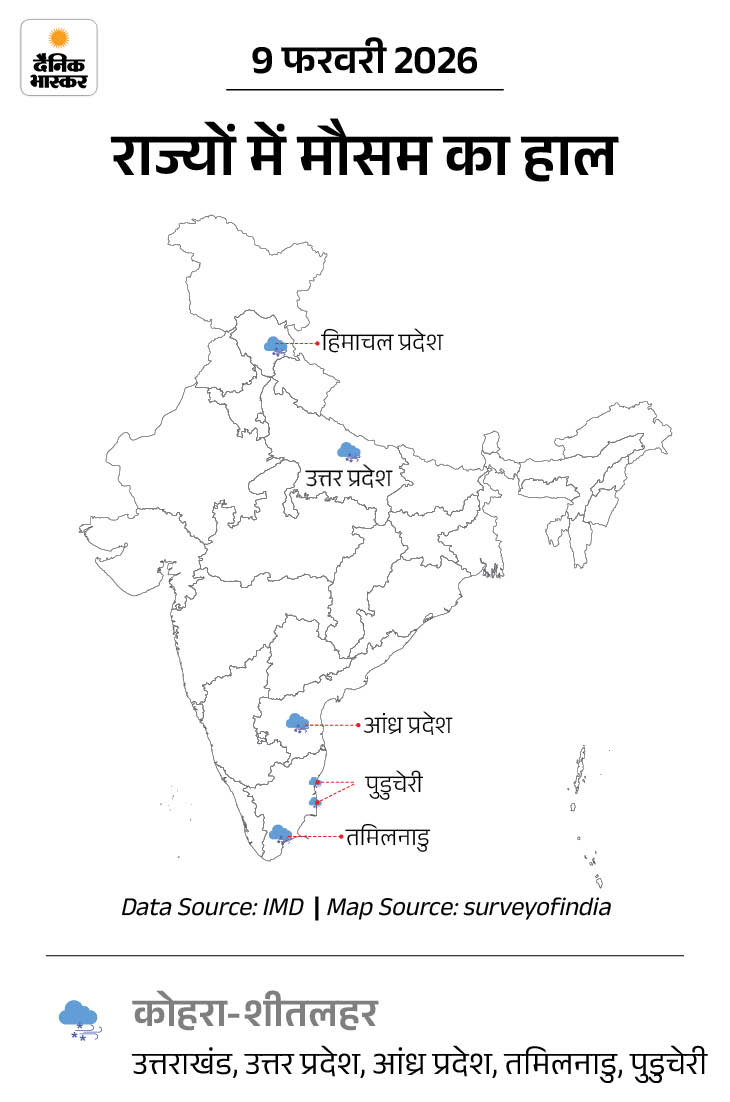 - 10 फरवरी: हिमाचल प्रदेश के ऊपरी इलाकों में हल्की से मध्यम बर्फबारी की संभावना है, दिल्ली, उत्तर प्रदेश, मध्य प्रदेश में सुबह मध्यम कोहरा रहेगा।