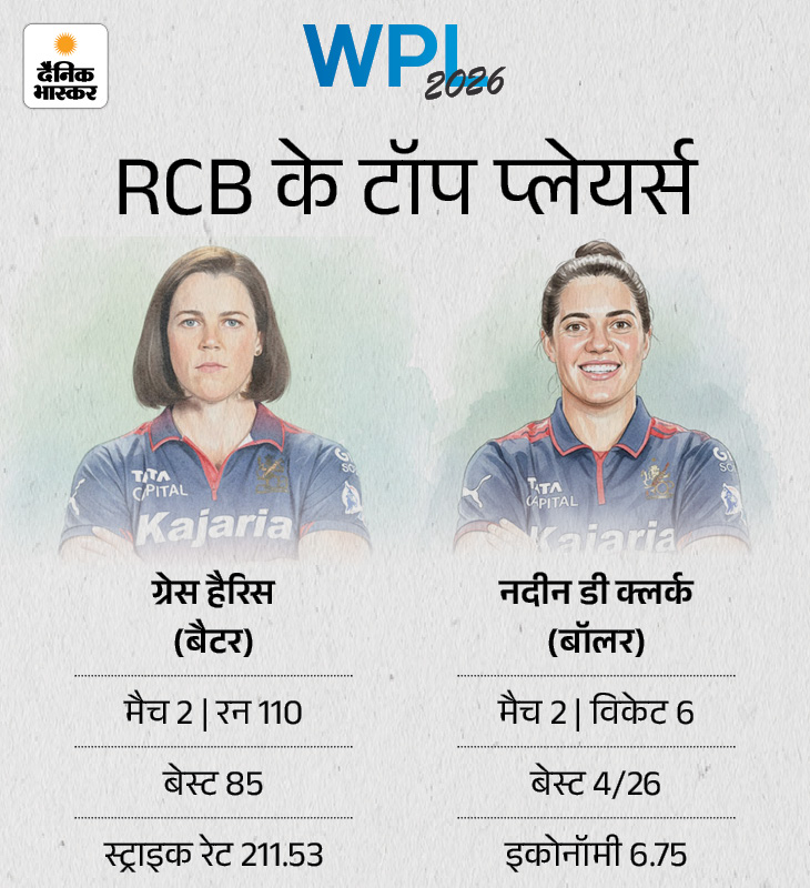 दूसरी ओर जेमिमा रोड्रिग्स की कप्तानी वाली दिल्ली कैपिटल्स ने 3 मैचों में एक जीत दर्ज की है, जबकि 2 मुकाबलों में उसे हार का सामना करना पड़ा है। दिल्ली 2 पॉइंट्स के साथ पॉइंट्स टेबल में चौथे स्थान पर है।