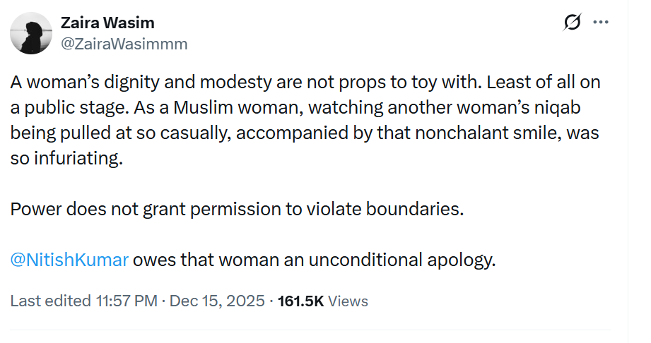 जायरा ने अपने एक्स अकाउंट पर नीतीश कुमार को टैग करके लिखा- एक महिला की गरिमा और मर्यादा कोई खिलौना नहीं है, जिससे खिलवाड़ किया जा सके। खासकर पब्लिक स्टेज पर तो बिल्कुल भी नहीं।