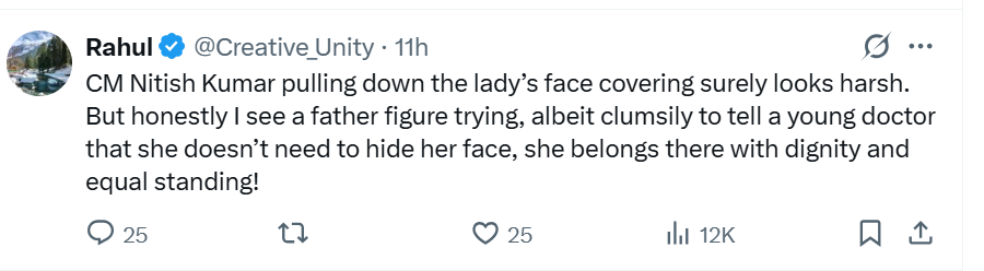 जायरा के इस पोस्ट पर यूजर्स की मिली जुली प्रतिक्रिया आ रही है। राहुल नाम के एक यूजर ने सीएम के सपोर्ट में लिखा- ‘नीतीश कुमार का हिजाब खींचना देखने में अपमानजनक लग सकता है लेकिन सच कहूं तो मुझे एक पिता तुल्य व्यक्ति की तरह लग रहा है, जो एक युवा डॉक्टर को, भले ही थोड़ी अटपटी तरह से, यह समझाने की कोशिश कर रहा है कि उसे अपना चेहरा छुपाने की जरूरत नहीं है। वो वहां गरिमा और समान स्थान के साथ खड़ी है।’