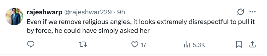 राजेश नाम के एक यूजर ने लिखा- ‘धार्मिक एंगल को हटा भी दें तो भी, जबरदस्ती खींचना बेहद अपमानजनक लगता है। वो उससे सीधे पूछ सकते थे।’