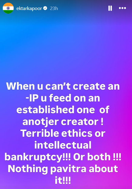 एकता कपूर ने नए शो पवित्र रिश्ता के मेकर्स पर भड़कते हुए आधिकारिक सोशल मीडिया अकाउंट से लिखा है, ‘जब आप खुद की कोई नई IP (आइडिया/कंटेंट) नहीं बना पाते, तो किसी दूसरे क्रिएटर की पहले से बनी आईपी पर पलते हो। यह बहुत खराब नैतिकता है या मानसिक दिवालियापन। या फिर दोनों। इसमें कुछ भी पवित्र नहीं है।’